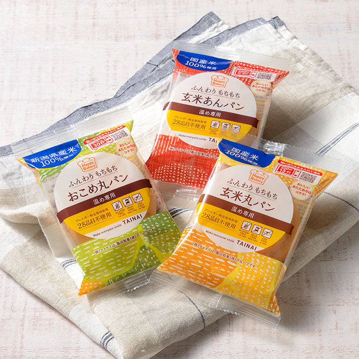 ラインナップは新潟県産米粉を100%使用した『おこめ丸パン』、国産玄米粉を100%使用した、玄米の栄養丸ごと食べられる『玄米丸パン』、国産玄米粉を100%使用した丸パンで、北海道産小豆を使用したあんこを包んだ『玄米あんパン』の3種類です。