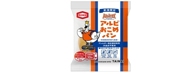 『アルビおこめパン』の主原料である米粉は新潟県産のみを使用しております。特定原材料等28品目不使用なので食物アレルギーをお持ちの方やグルテンフリーを嗜好されている方にも安心してお召し上がりいただける米粉パンです。電子レンジで温めていただくことでお米のほんのりとした甘さともちもち食感をお楽しみいただけます。アルビレックス新潟とコラボレーションしたパッケージは新潟県内のコンビニエンスストア、スーパーマーケットでお取り扱いのある一部店舗様や、亀田製菓株式会社のグループ企業の株式会社アジカル(亀田元町店)の売店で直接お買い求めいただける他、TAINAIオンラインショップでも販売いたします。尚、数量限定販売のため早期に販売が終了する場合がございますのであらかじめご了承ください。