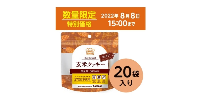 さて、この度賞味期限間近の『玄米クッキーココア味』を20袋セットにした特別価格品を数量限定で販売いたします。配送料無料の特別価格として、ご注文を2022年8月4日(木)15:00から2022年8月8日(月)15:00まで受け付けます。発送は申込終了日から3日以内に対応いたします。先着32ケースですので、ぜひこのお買い得な機会にお申し込みください。